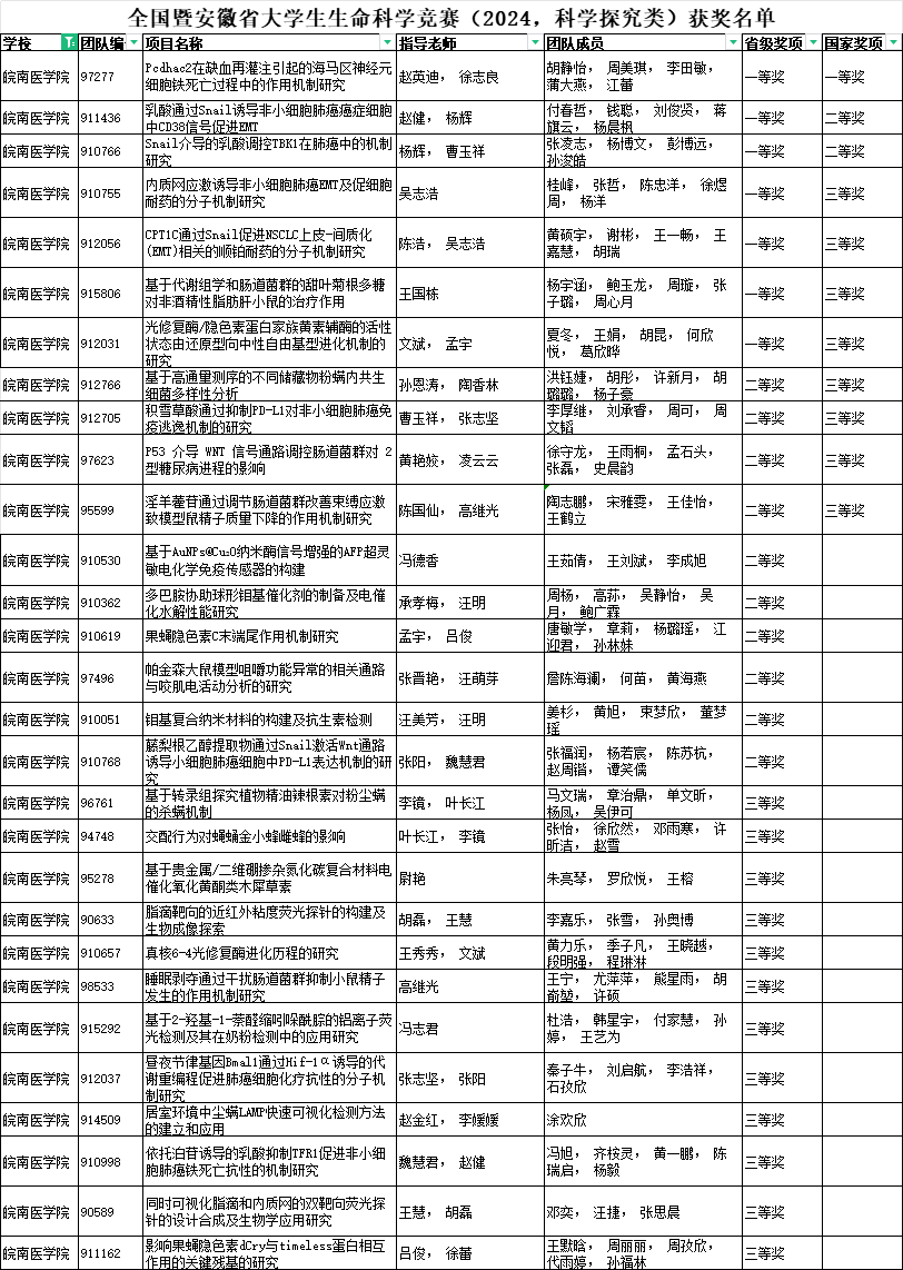 本项赛事分为省赛和国赛两个阶段。省赛于2023年10月正式启动,由安徽省教育厅主办、安徽师范大学协办,共有省内26所公司的741个团队参加比赛。经过参赛队伍提交立项报告、上传实验记录到完成论文,再经过网评,最终评出144项队伍进入决赛。进入决赛的项目通过现场答辩最终评出一、二、三等奖。公司共有56个团队参加省赛,最终获奖29项,其中3个团队被推荐参加第九届全国老员工生命科学竞赛(科学探究类)决赛。最终,人体解剖学教研室赵英迪和徐志良老师带领的员工团队获得国赛一等奖,另外两个团队获得国赛二等奖。