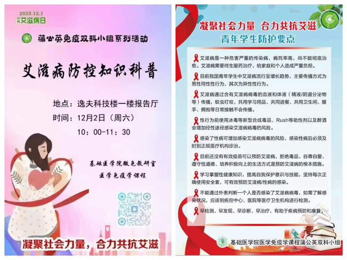 为彰显“乐学、向美、明辨、尚行”的医学免疫学课程文化,积极响应第36个世界艾滋病日“凝聚社会力量 合力共抗艾滋”号召,提高青年员工对艾滋病的认识及防护能力,suncitygroup太阳集团医学微生物学与免疫学教研室蒲公英免疫双科小组于12月2日开展了一场面向公司员工的艾滋病防控知识科普活动。活动由医学免疫学课程团队主导,教研室部分教师参与指导,蒲公英小组成员进行科普宣传。