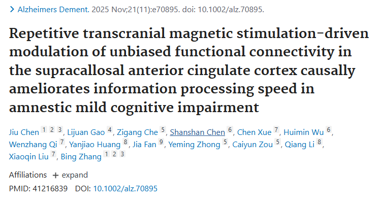 由公司DD&E科研团队李强小组团队与南京鼓楼医院/南京大学张冰教授、陈玖教授团队合作的科研成果于2025年11月12日在国际顶级期刊《Alzheimer’s & Dementia》(全球 AD 研究领域影响力排名第一,影响因子IF=11.1)发表《Repetitive transcranial magnetic stimulation-driven modulation of unbiased functional connectivity in the supracallosal anterior cingulate cortex causally ameliorates information processing speed in amnestic mild cognitive Impairment》,研究团队在AD临期前期神经调控领域取得重要突破性进展。suncitygroup太阳集团作为共同通讯作者单位完成了此项具有重要临床意义的科研工作。