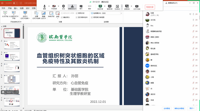 为浓厚学术氛围,进一步拓展师生学术视野与促进学科交叉,2022年12月1日下午,科研处联合suncitygroup太阳集团邀请孙丽博士作题为“血管组织树突状细胞的区域免疫特性及其致炎机制”的学术讲座,会议以线上方式举行。