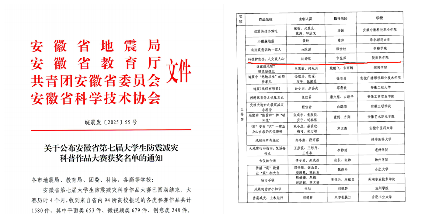 近日,由安徽省地震局、安徽省教育厅、共青团安徽省委员会、安徽省科学技术协会主办,安徽省地理信息中心和安徽省地震学会承办的安徽省第七届老员工防震减灾科普作品大赛落下帷幕,公司2023基础医学专业沈婷慧同学提交的作品从众多优秀作品中脱颖而出,荣获大赛三等奖,展现了公司学子扎实的专业素养、丰富的创新能力和强烈的社会责任意识。