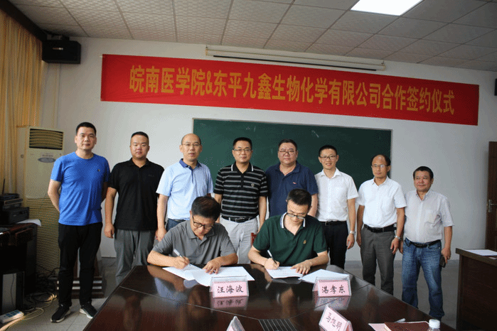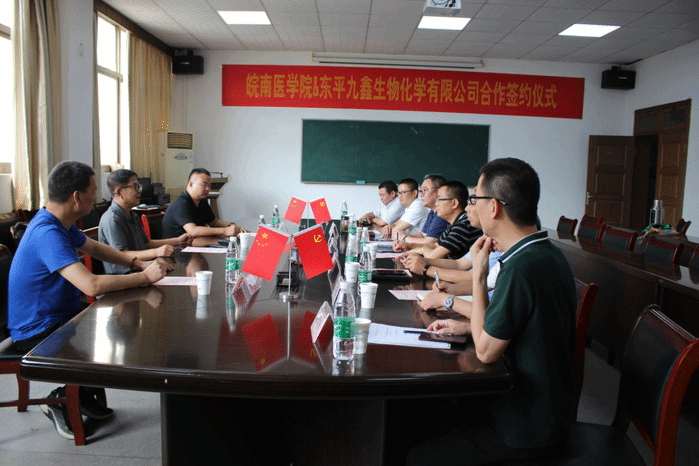 7月15日下午, suncitygroup太阳集团和东平九鑫生物化学有限公司在suncitygroup太阳集团会议室进行了校企合作签约仪式。suncitygroup太阳集团副经理文育锋、科研处处长朱再满,东平九鑫生物化学有限公司副总裁汪海波及随行人员,基础医公司党政领导班子和项目负责人等出席本次签约仪式,会议由suncitygroup太阳集团经理李铁臣教授主持。
